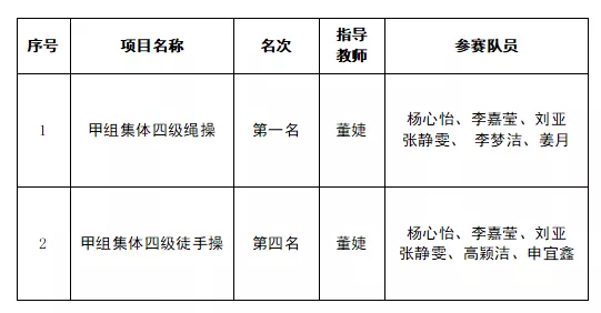经过艰苦训练,同学们充分发扬了艰苦奋斗、勇于拼搏的体育精神。在激烈角逐中,kaiyun官网在本次大赛中取得了“四级绳操”甲组全国第一名以及“四级徒手”甲组全国第四名的好成绩。