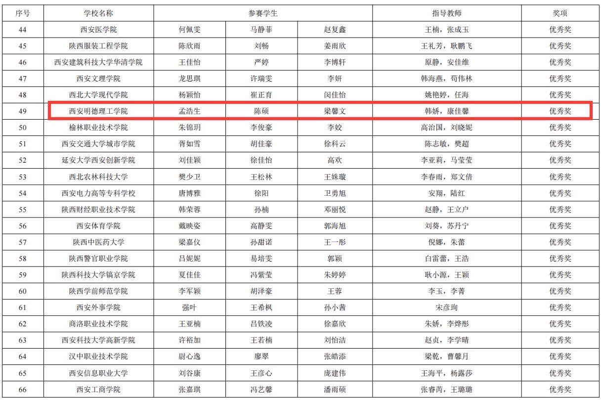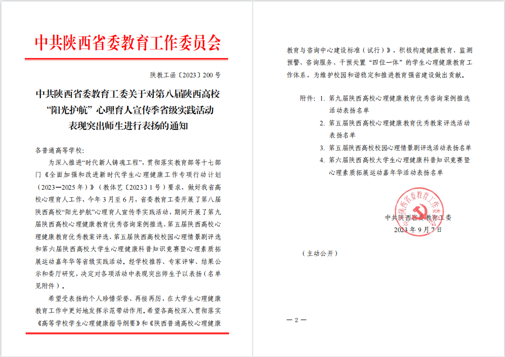 近日,在《中共陕西省委教育工委公布的陕西高校第八届“阳光护航”心理育人宣传季省级实践活动表现突出师生进行表扬的通知》中,我院大学生心理健康教育教研室三名教师受到通报表扬。本次活动从今年3月份起,经学院、学校推荐、专家评审、结果公示和委厅研究等程序,最终,我院专职心理健康教育教师王蕊的教案《做情绪的主人——情绪与心理健康》、兼职心理教师郭学鹏的教案《换位思考赢得共情——大学生人际交往心理》荣获第五届陕西高校心理健康优秀教案评选三等奖;由专职心理教师韩娇老师、国际教育学院辅导员康佳馨作为指导老师,国际教育学院孟浩生、陈硕、梁馨文三位同学作为参赛学生在第六届陕西高校大学生心理健康科普知识竞赛中荣获优秀奖。