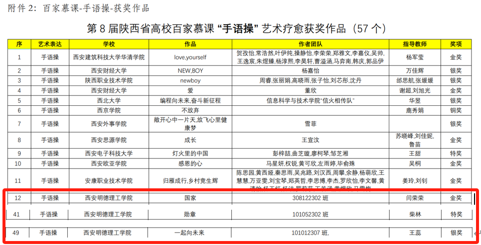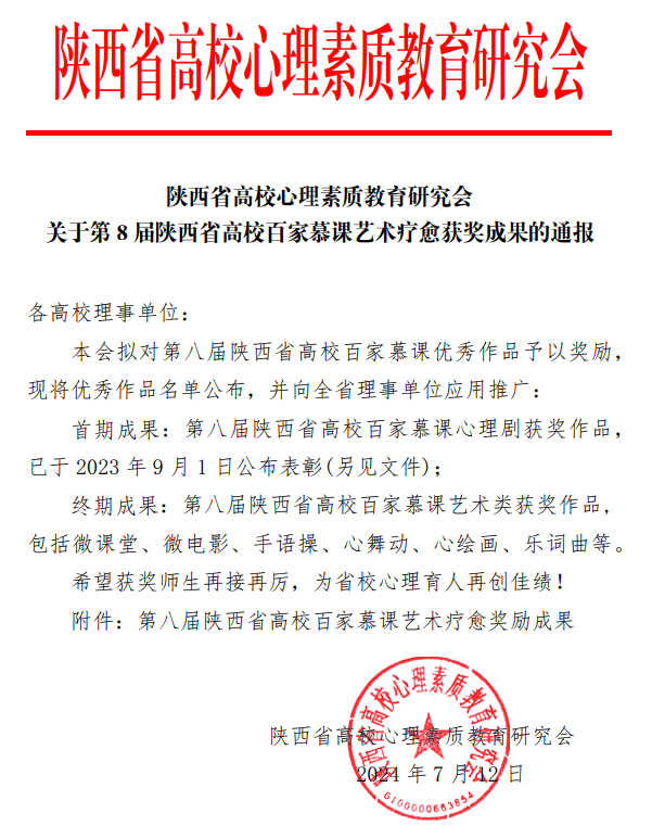 近日,陕西省高校心理素质教育研究会公布了《关于第8届陕西省高校百家慕课艺术疗愈获奖成果的通报》,kaiyun官网荣获多项荣誉。《勋章》《国家》《一起向未来》在“手语操”艺术疗愈作品评比中分别荣获特奖、金奖、银奖,《寻我》《破缄》《净迷》在“微电影”艺术疗愈作品评比中分别荣获特奖、金奖、银奖。